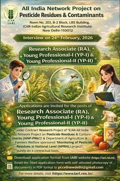 Applications are invited from eligible candidates for the following contractual positions under the ICAR-AINP-PR&C project and Department of Agriculture & Farmers Welfare sponsored Monitoring of Pesticide Residues at National Level (MPRNL) project:
